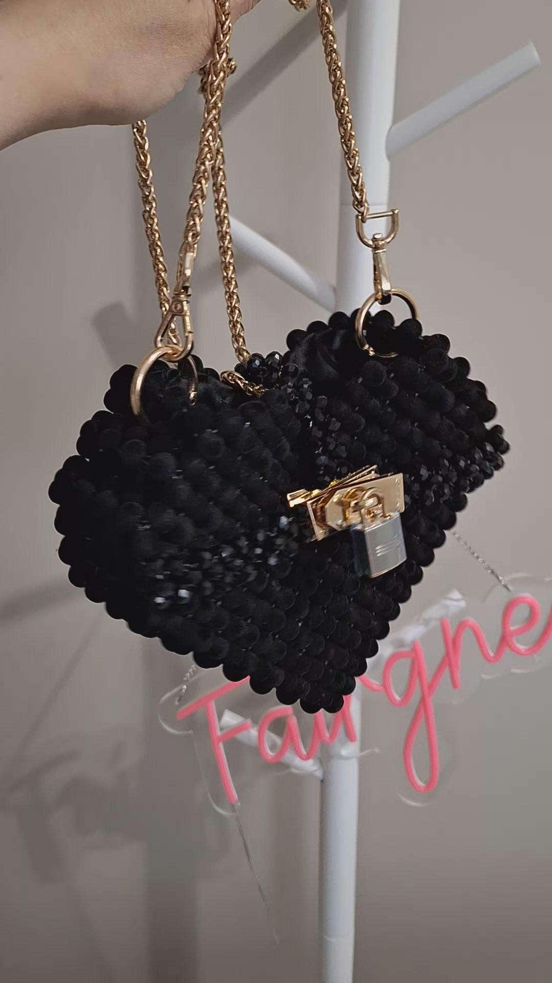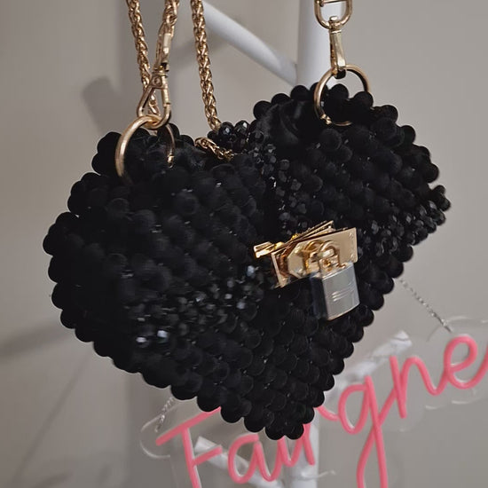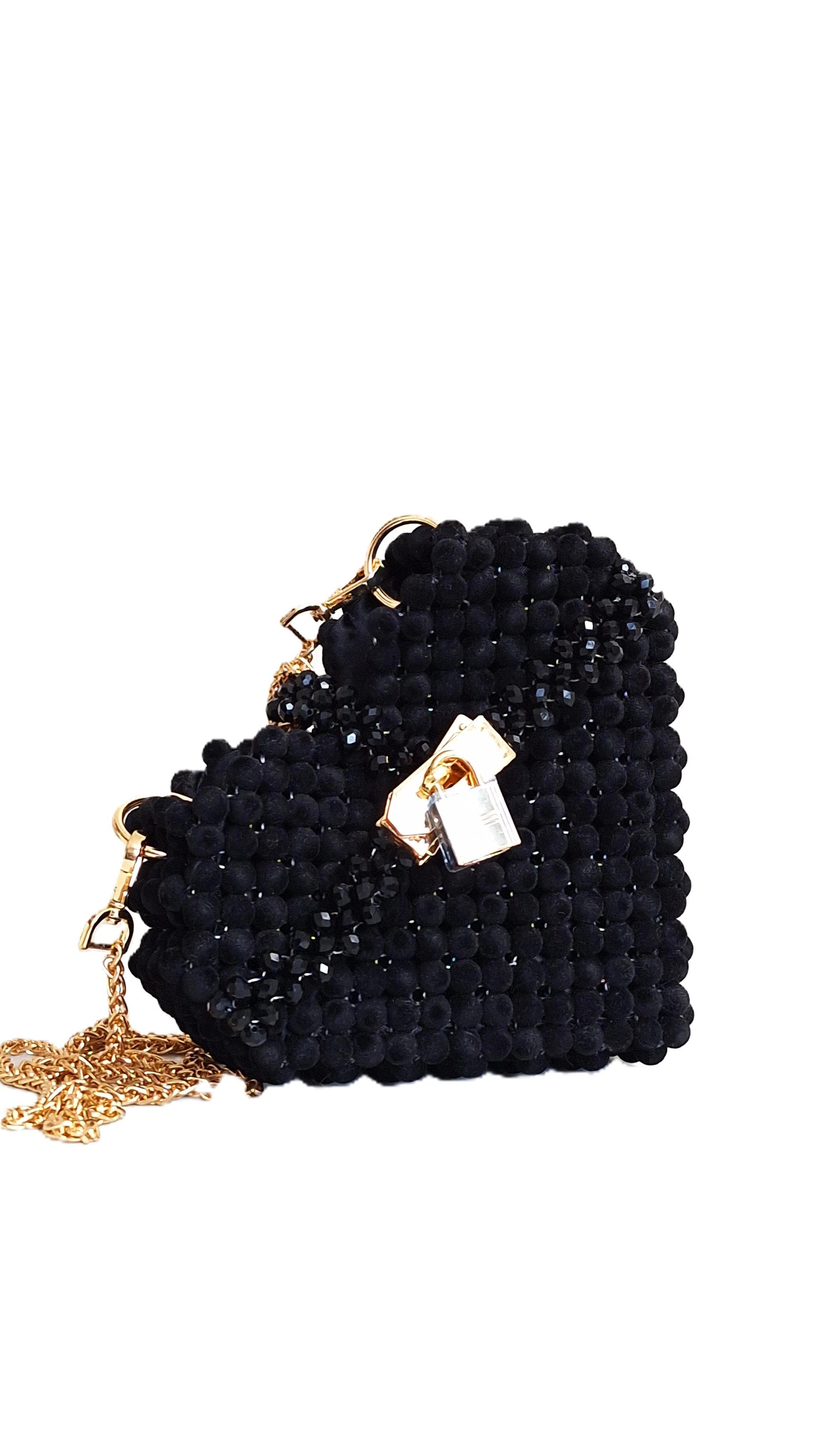 This striking heart-shaped handbag combines luxe materials with distinctive design. Crafted in black with intricate velvet and glass bead detailing, it delivers visual depth and tactile richness. The gold chain strap offers both elegance and versatility—wear it crossbody for everyday ease or on the shoulder for refined occasions. A statement piece that elevates any ensemble while maintaining the structured sophistication expected of premium accessories.