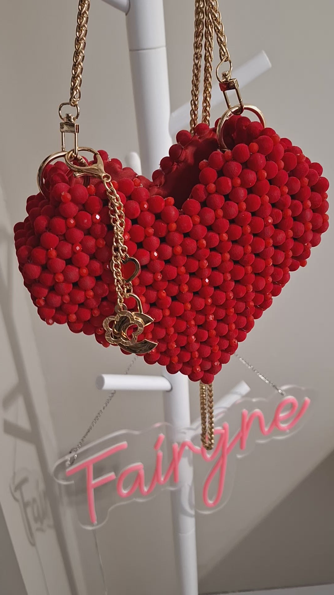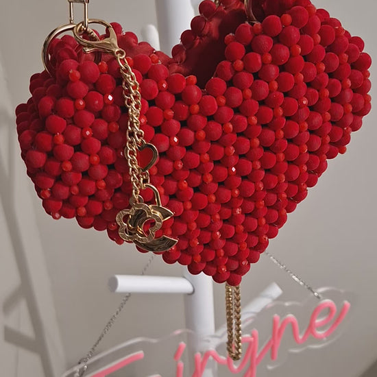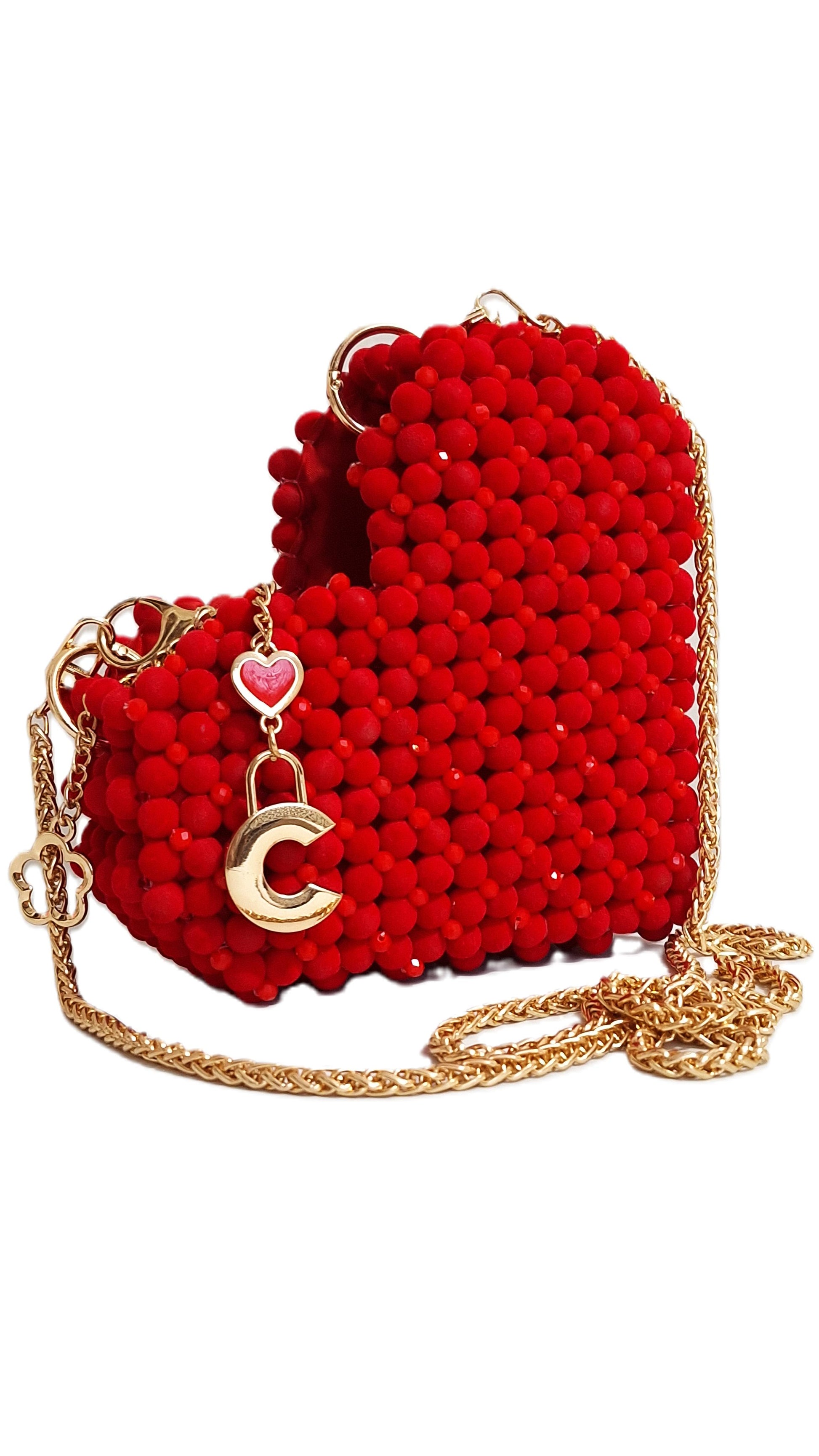 This striking heart-shaped handbag combines luxe materials with distinctive design. Crafted in red with intricate velvet and glass bead detailing, it delivers visual depth and tactile richness. The gold chain strap offers both elegance and versatility—wear it crossbody for everyday ease or on the shoulder for refined occasions. A statement piece that elevates any ensemble while maintaining the structured sophistication expected of premium accessories.