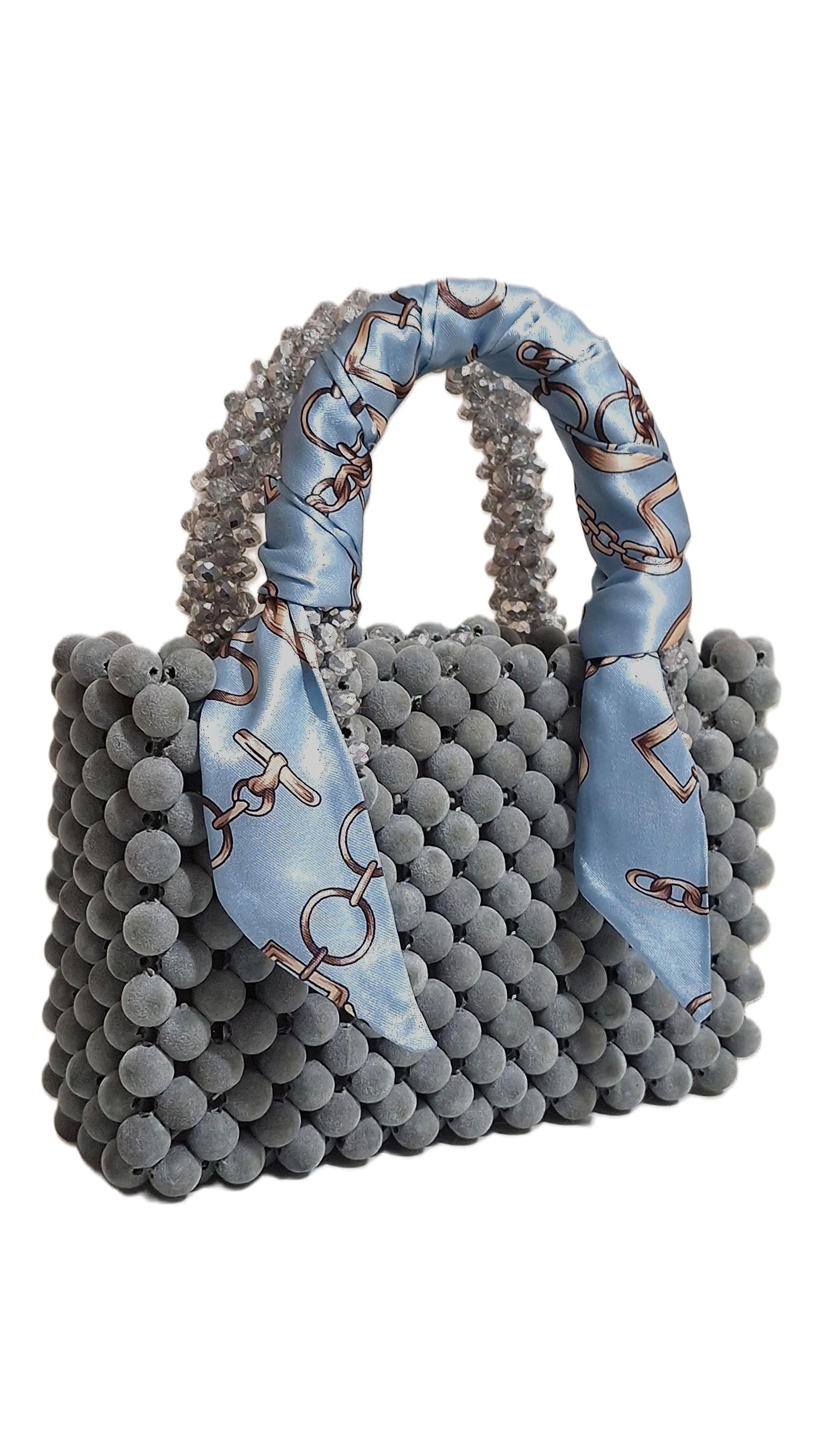 Discover understated opulence in this meticulously crafted handbag. Soft grey velvet beads compose the silhouette, creating a foundation of quiet elegance, while a silver glass beaded handle introduces prismatic brilliance and refined articulation. The juxtaposition of muted and luminous surfaces elevates the piece beyond conventional accessory design. Perfect for those who seek distinctive craftsmanship and appreciate how restraint and precision define true luxury.