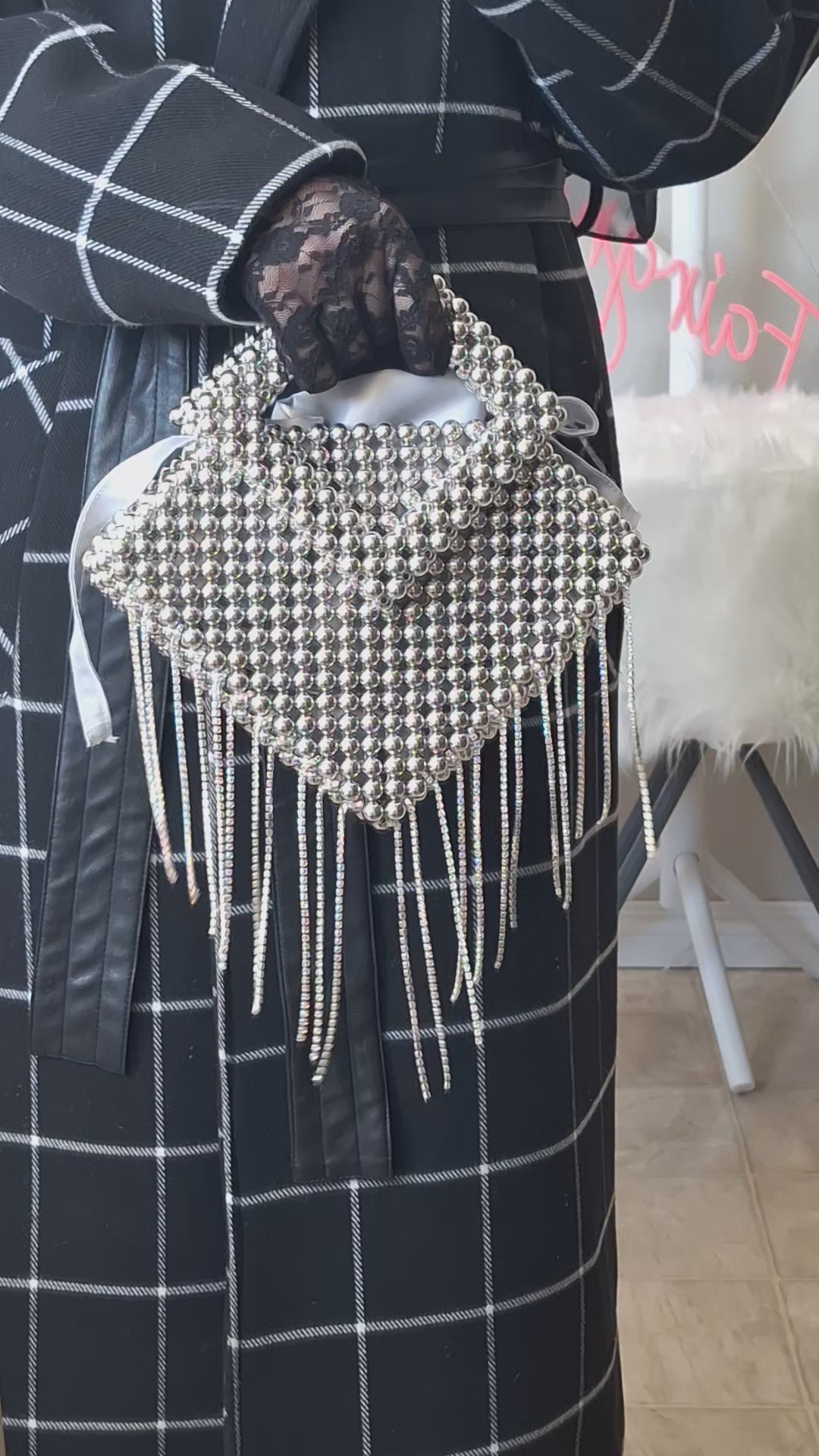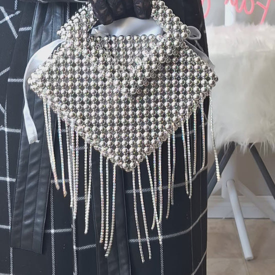 This handbag is adorned with delicate silver beads and sparkling rhinestone dangling chains, offering a sophisticated blend of texture and shimmer. Designed with expert craftsmanship, it elevates any outfit with subtle luxury while maintaining practical elegance for versatile use.