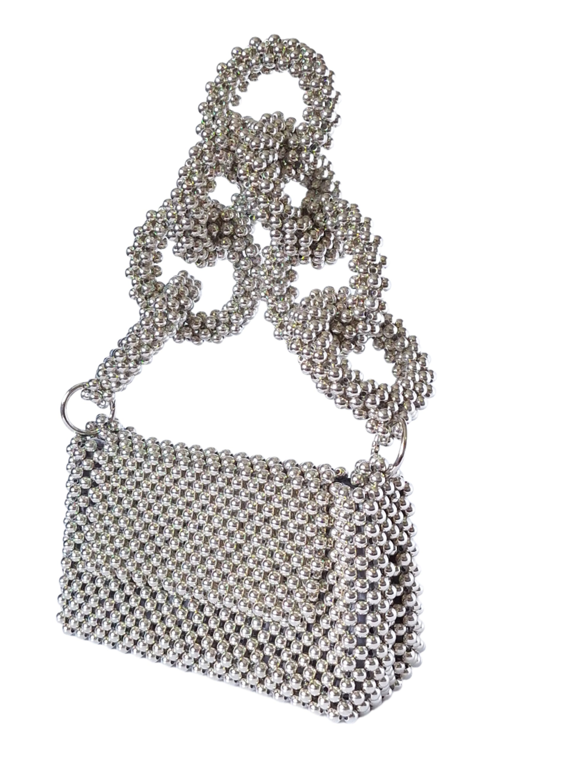 This handbag features a sophisticated beaded chain crafted from silver beads, combining durability with refined elegance. The silver bead detailing enhances the bag’s aesthetic, making it a versatile accessory for both formal and casual occasions. Designed with expert craftsmanship, the beaded chain ensures comfortable carrying while adding a distinctive touch of luxury. Ideal for those who value quality and timeless style.