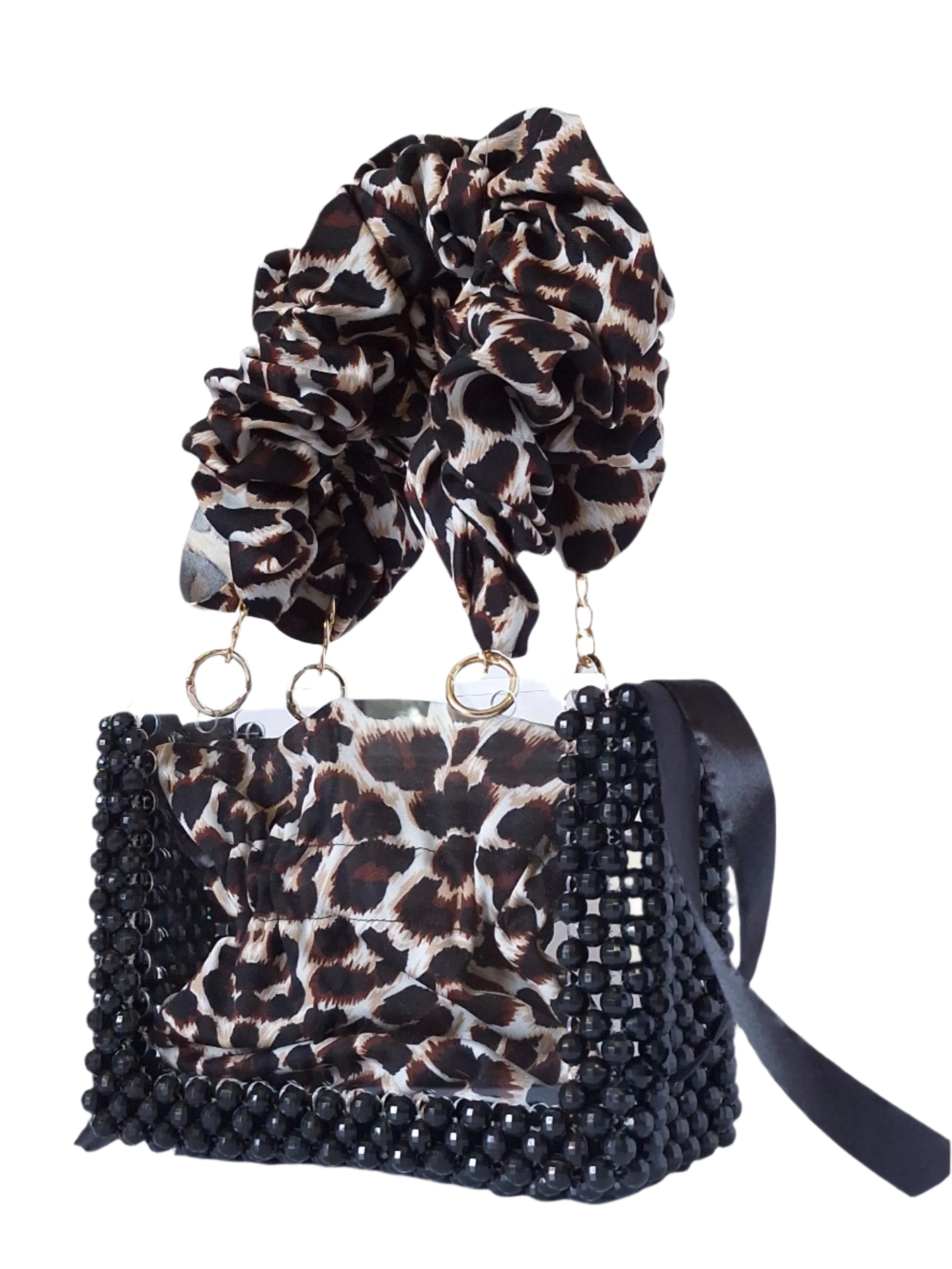 This handbag features a sophisticated combination of black acrylic beads and transparent acrylic elements, creating a striking visual contrast. The interior is lined with a stylish animal print, adding a touch of bold elegance while protecting your belongings. Expertly crafted, this accessory balances durability with distinctive design, making it a versatile choice for both everyday use and special occasions.