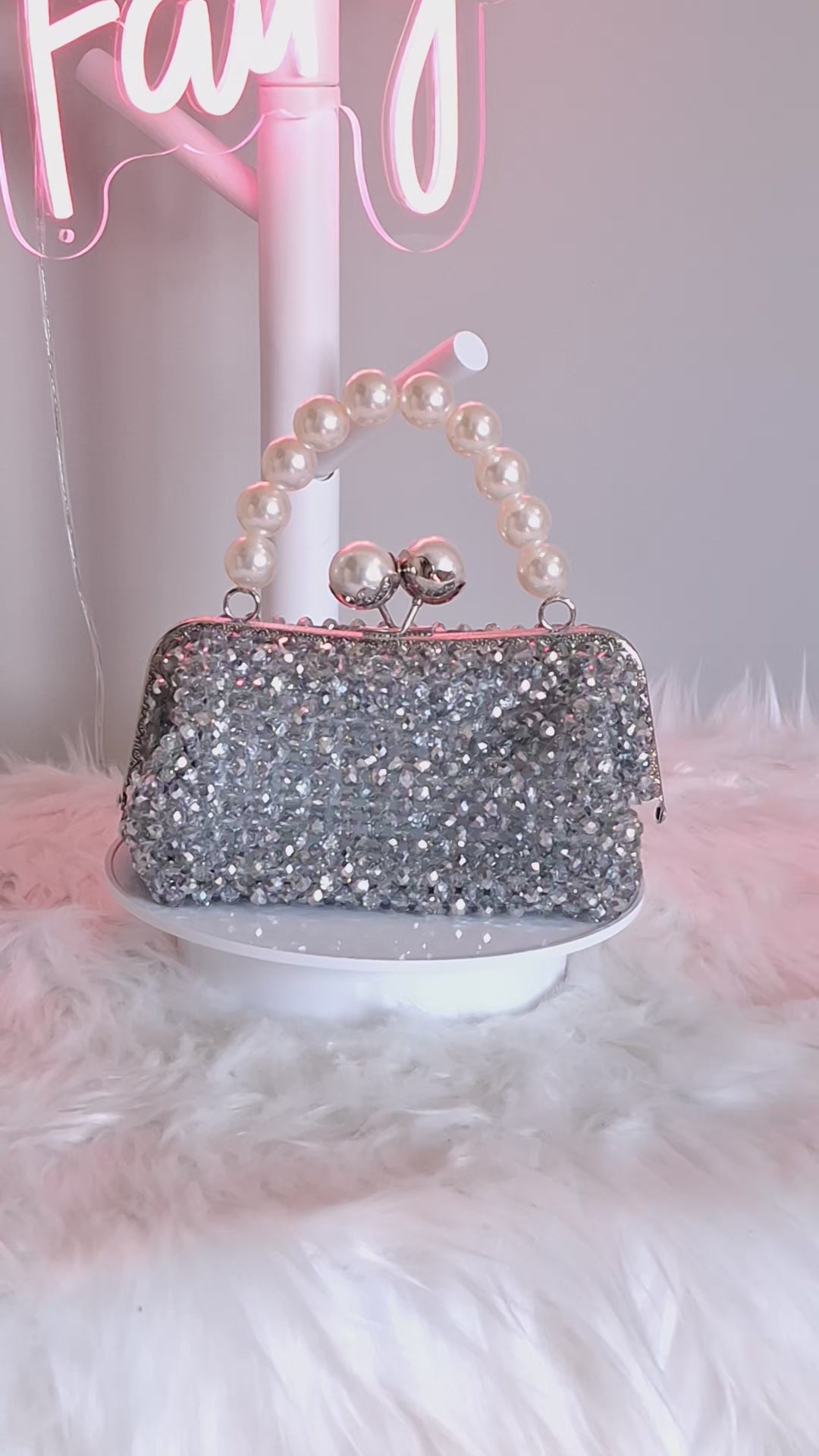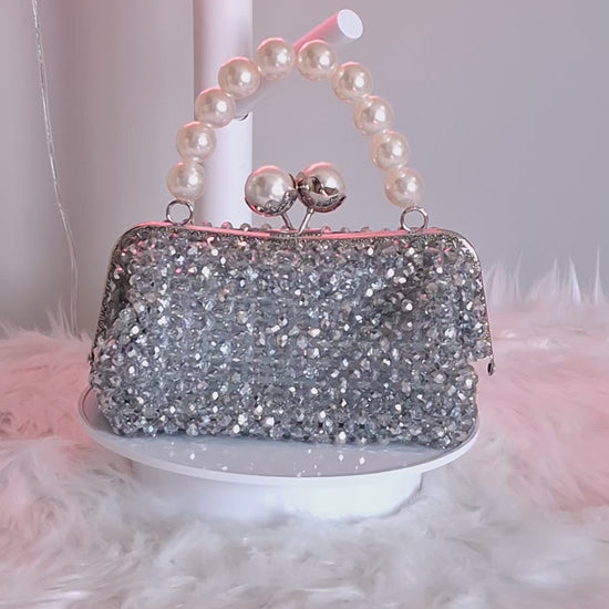 This elegant handbag features a refined silver frame complemented by delicate silver glass beads, adding a touch of sophistication. The imitation pearl handle enhances its classic appeal, making it an ideal accessory for formal occasions or stylish evenings. Crafted to combine aesthetic charm with practical design, this handbag offers both beauty and functionality.