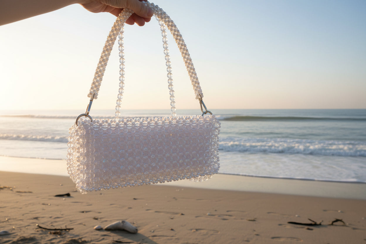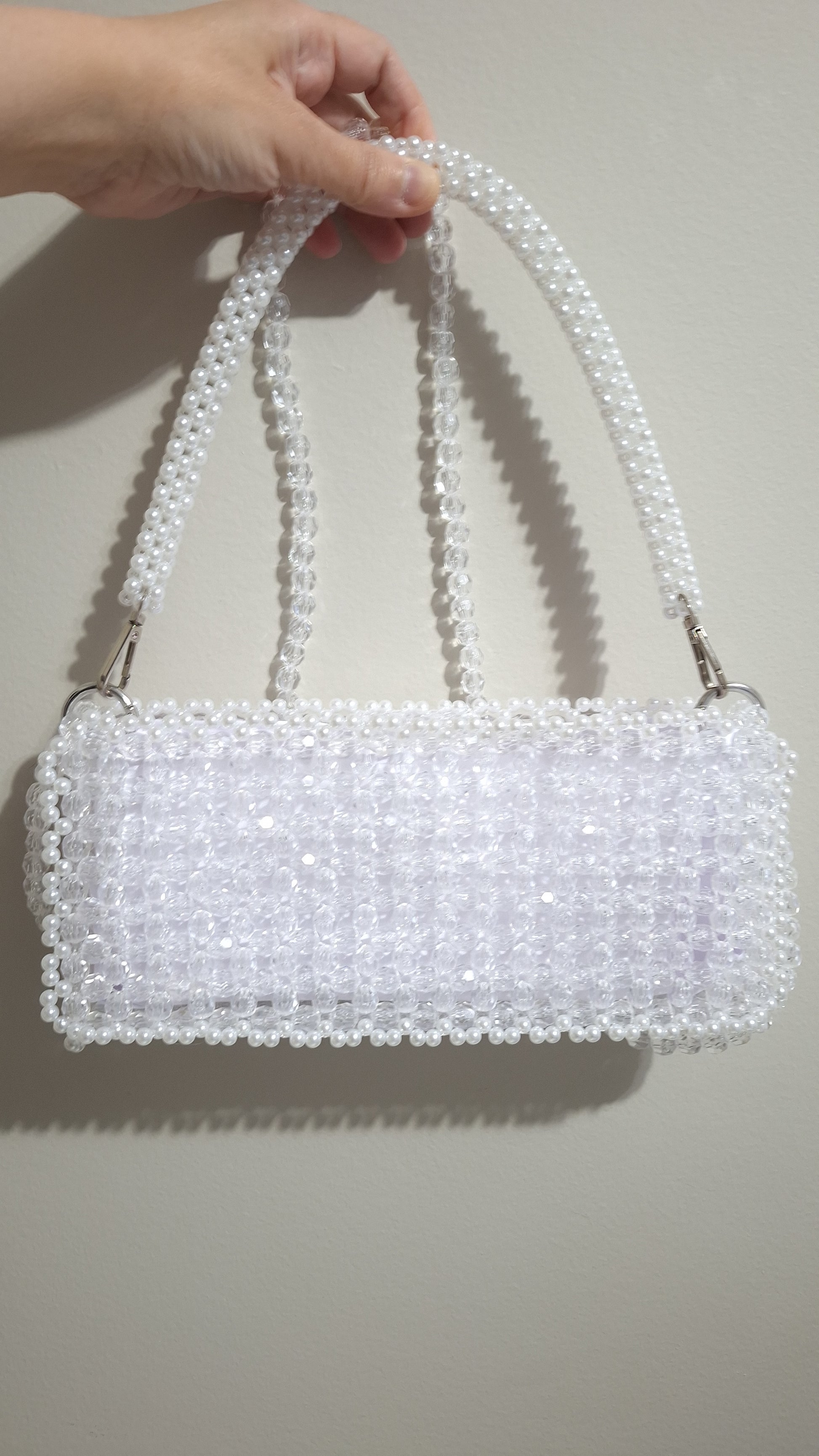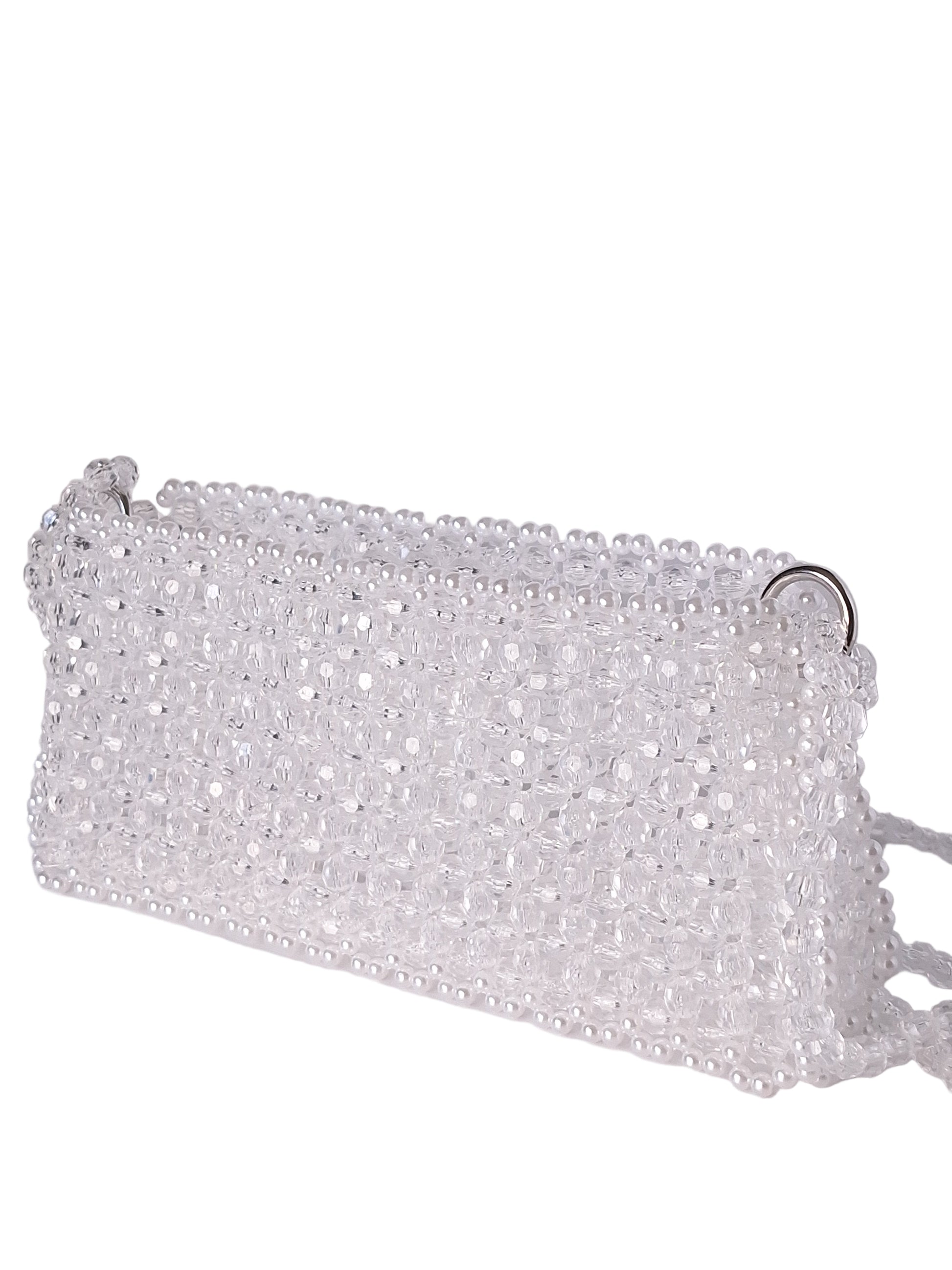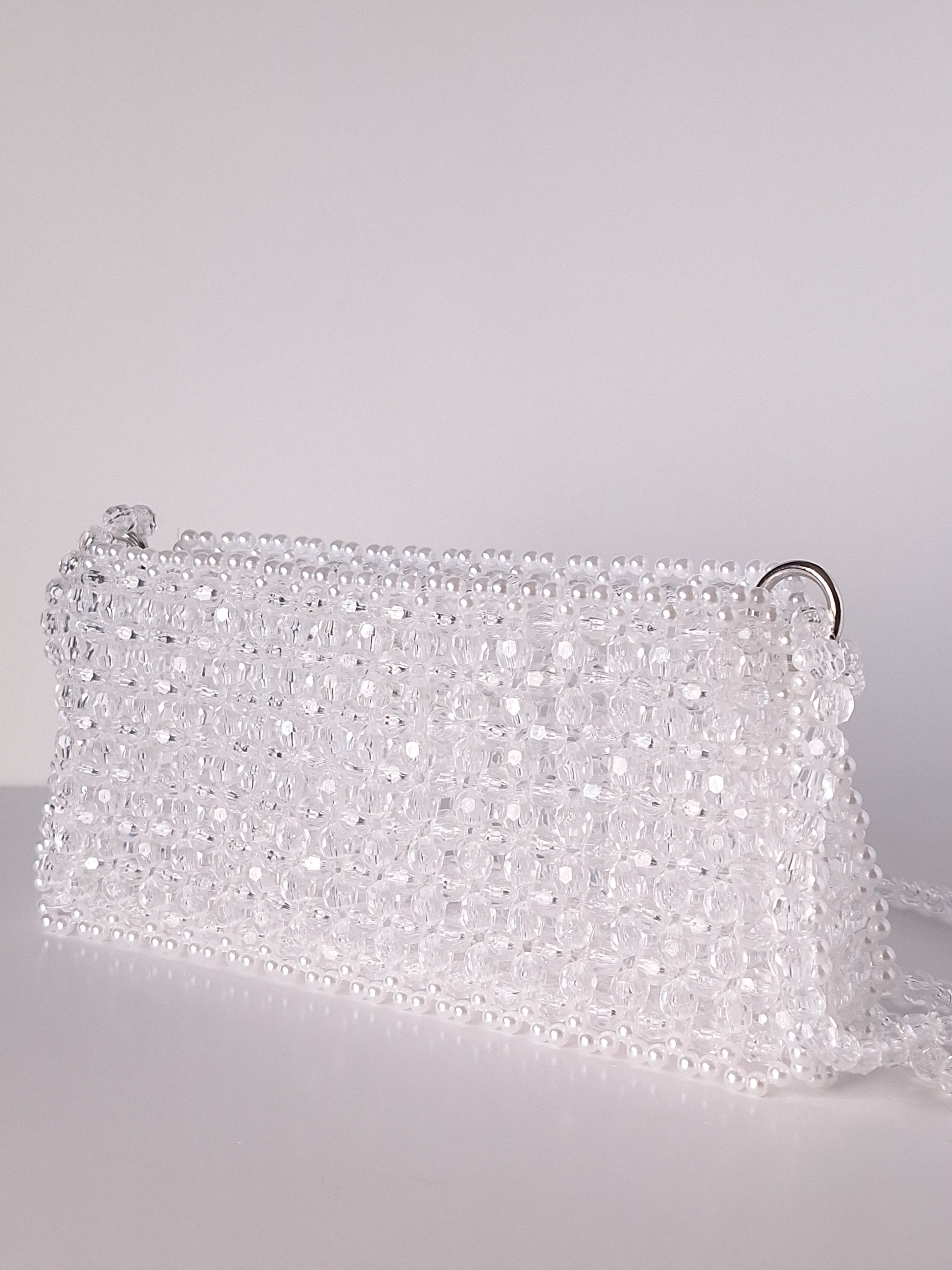 This handbag is adorned with white acrylic beads and white imitation pearls, offering a sophisticated and timeless aesthetic. The combination of these materials provides a refined look while ensuring durability and ease of maintenance. Perfect for elevating both formal and casual ensembles, this accessory balances elegance with practicality.