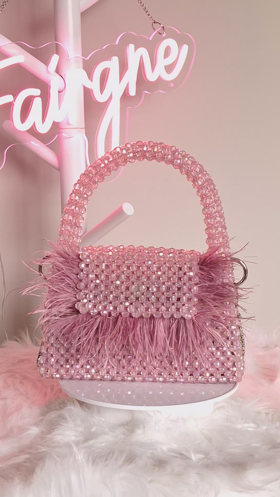 This handbag expertly combines soft pink acrylic beads with a refined silver chain, enhanced by a distinctive fashion feather detail. Crafted to elevate your style, it offers a sophisticated accessory that balances contemporary design with timeless elegance. Ideal for adding a subtle yet striking accent to any outfit.