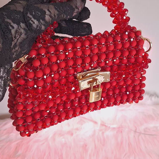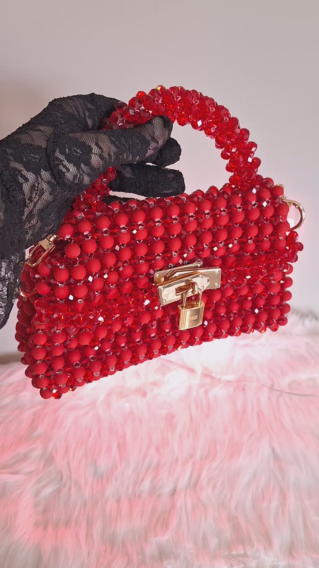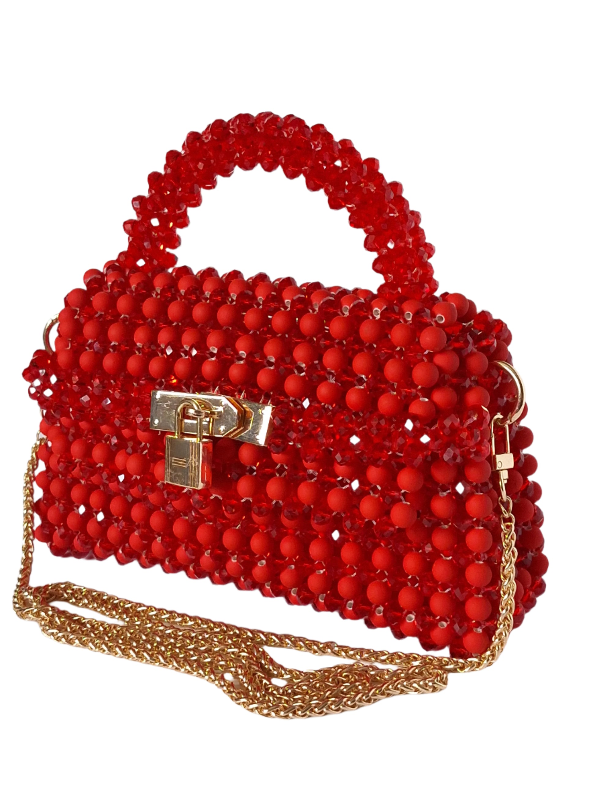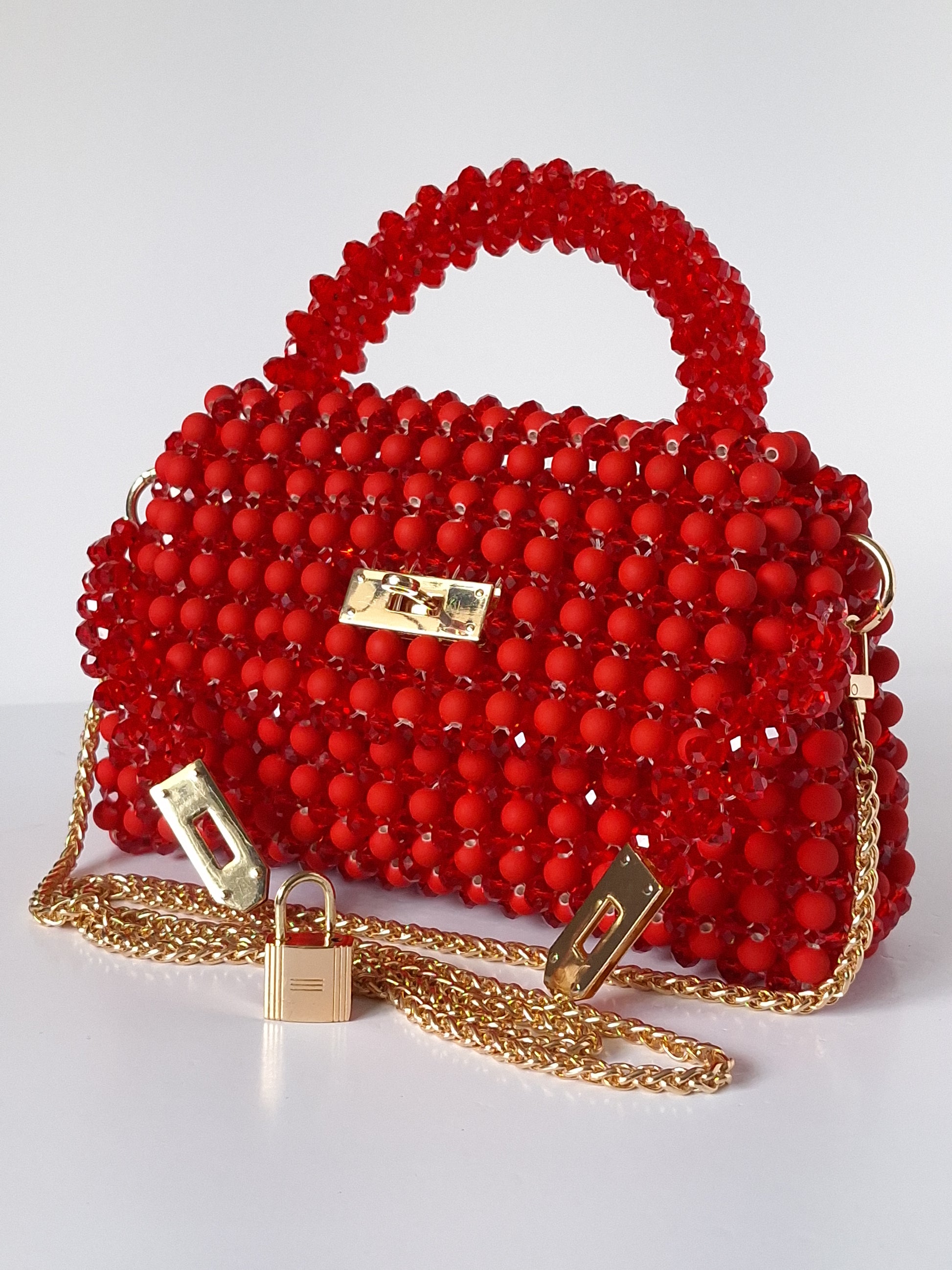 This handbag showcases a refined blend of red matt acrylic and glass beads, paired with a luxurious gold chain and a gold lock. Its expert craftsmanship highlights a sophisticated design that combines vibrant materials with elegant metallic details, perfect for elevating any ensemble.