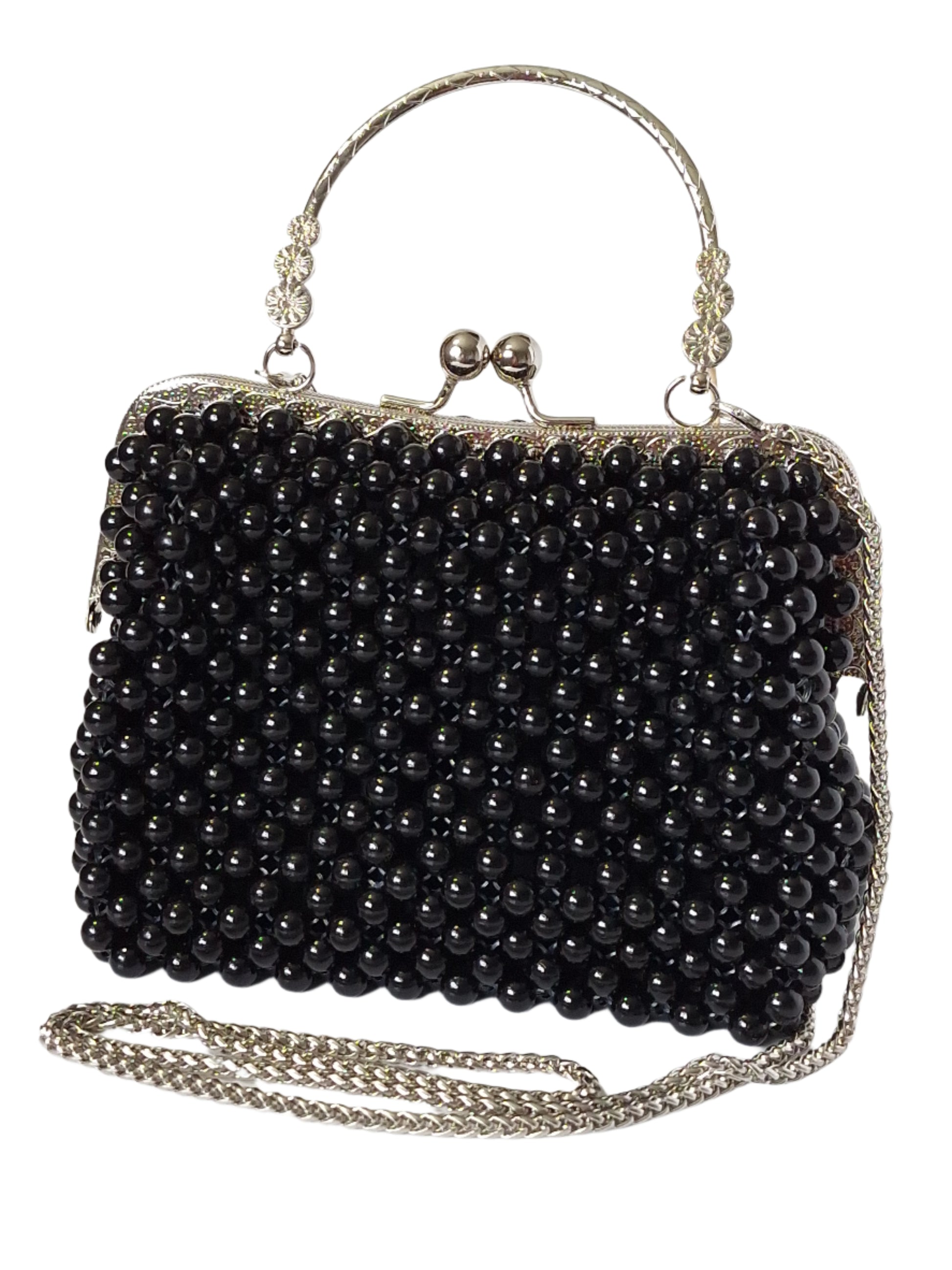 This elegant handbag features a striking combination of black beads set within a refined silver frame, complemented by a sleek silver chain. Its sophisticated design offers both style and durability, making it an ideal accessory for formal occasions or upscale events. The silver elements enhance its timeless appeal, while the black beads add a touch of modern elegance.