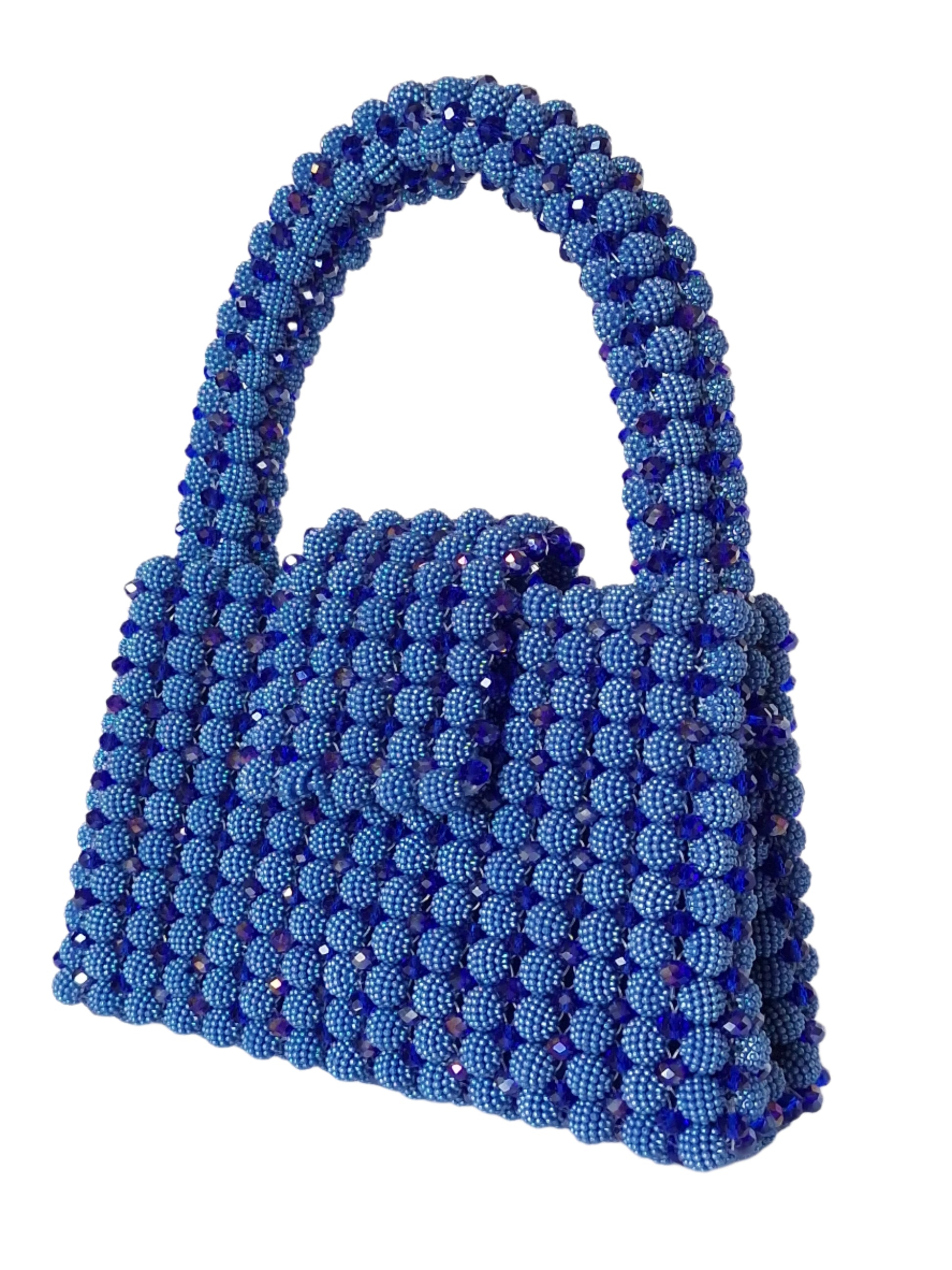 This handbag features a sophisticated blend of blue bayberry beads and blue glass beads, complemented by a stylish fashion feather accent. The combination of these elements creates a unique texture and visual appeal, making it an elegant accessory for any occasion. Crafted with attention to detail, it offers both aesthetic charm and a touch of artisanal craftsmanship.