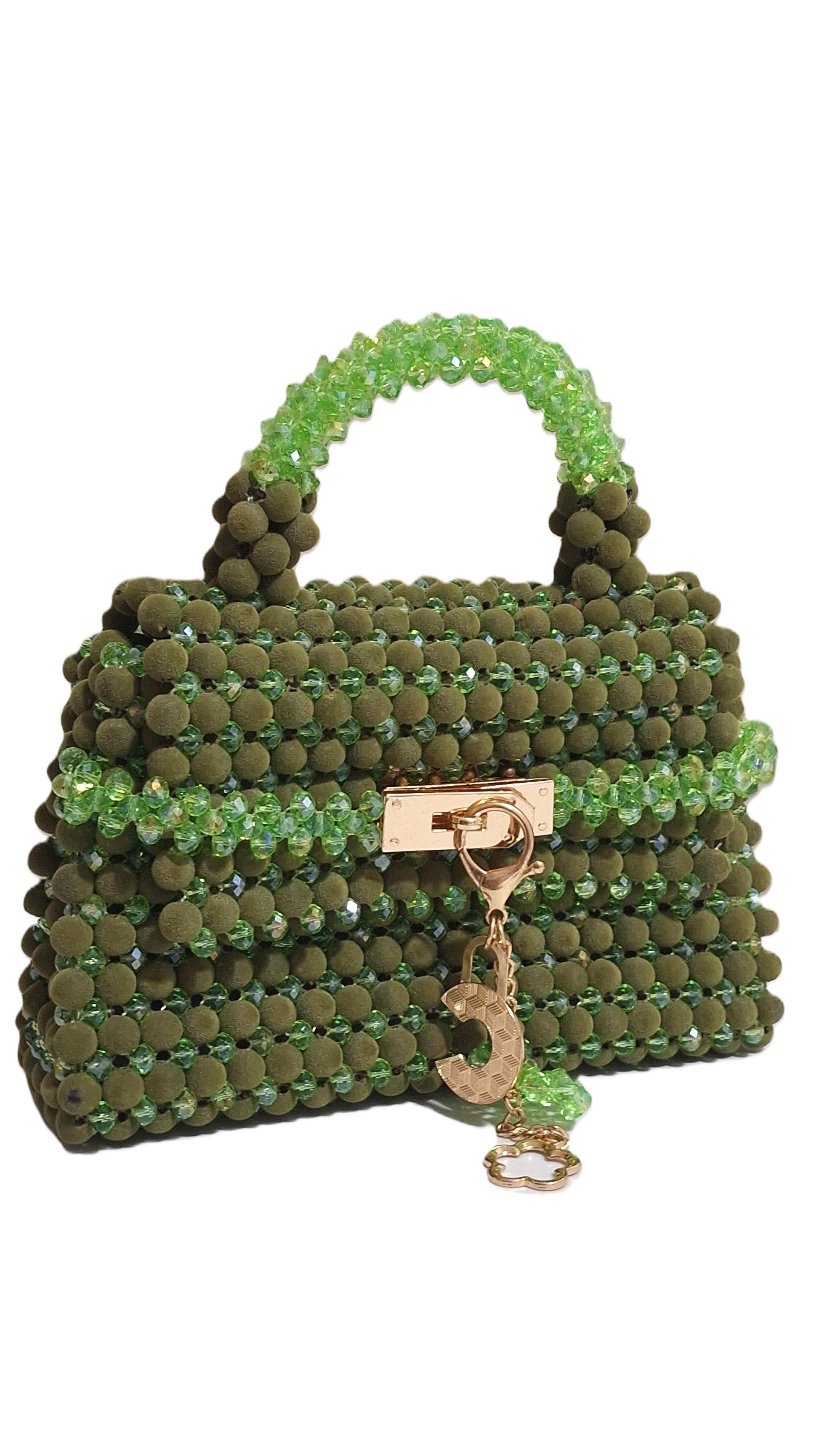 This handbag is an exquisite statement of opulence and artistry. Wrapped in sumptuous olive green velvet, this handbag dazzles with meticulously placed kelly green glass beads that sparkle with every movement. The luxurious interplay between soft, rich velvet and brilliant crystalline embellishment creates an unmistakably glamorous effect. Perfect for those who desire a show-stopping accessory that celebrates bold color and impeccable craftsmanship.